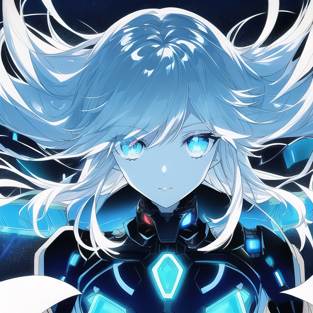 - Mechanical body with black and white hair, both long and messy with blue eyes and slit pupils