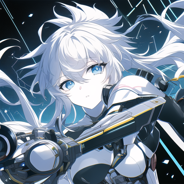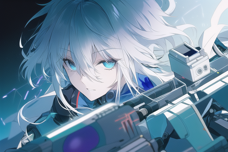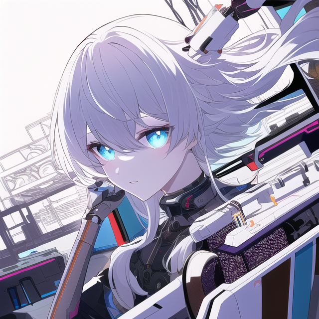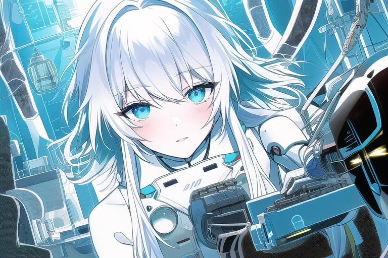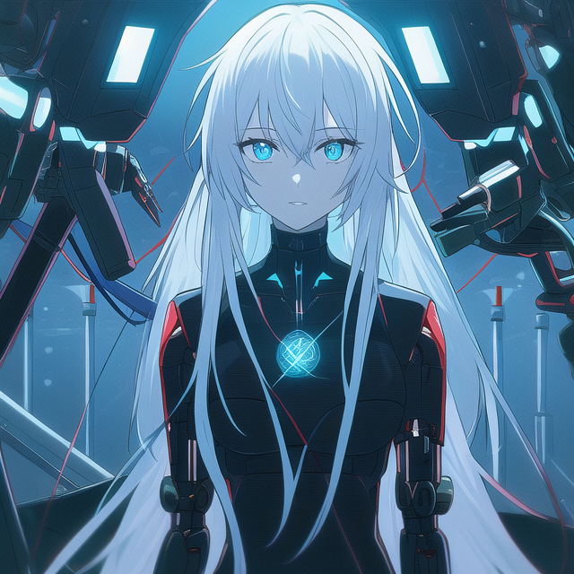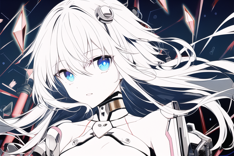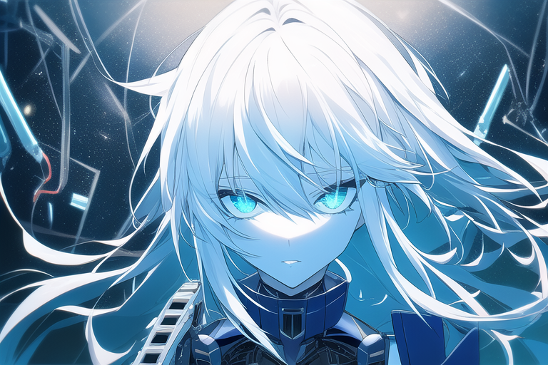 • Mechanical body with black and white hair, both long and messy with blue eyes and slit pupils