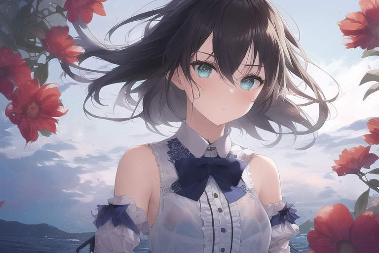 ((masterpiece)), (((best quality))), ((ultra-detailed)), ((illustration)), ((disheveled hair)), ((frills)), (1 girl), (solo), dynamic angle, big top sleeves, floating, beautiful detailed sky, on beautiful detailed water, beautiful detailed eyes, overexposure, (fist), expressionless, side blunt bangs, hairs between eyes, ribbons, bowties, buttons, bare shoulders, (((small breast))), detailed wet clothes, blank stare, pleated skirt, flowers