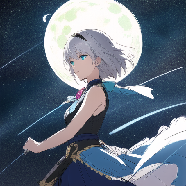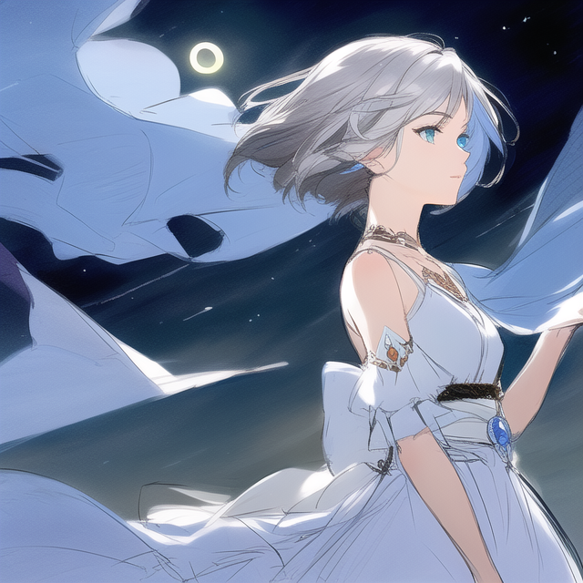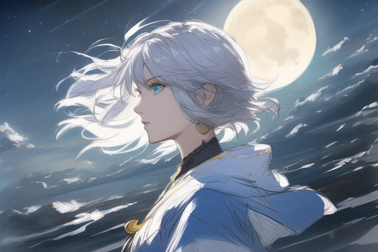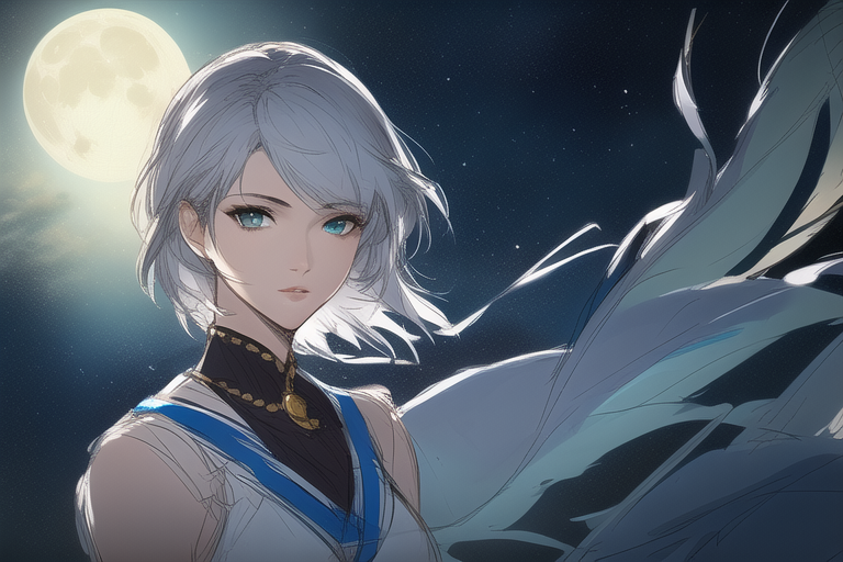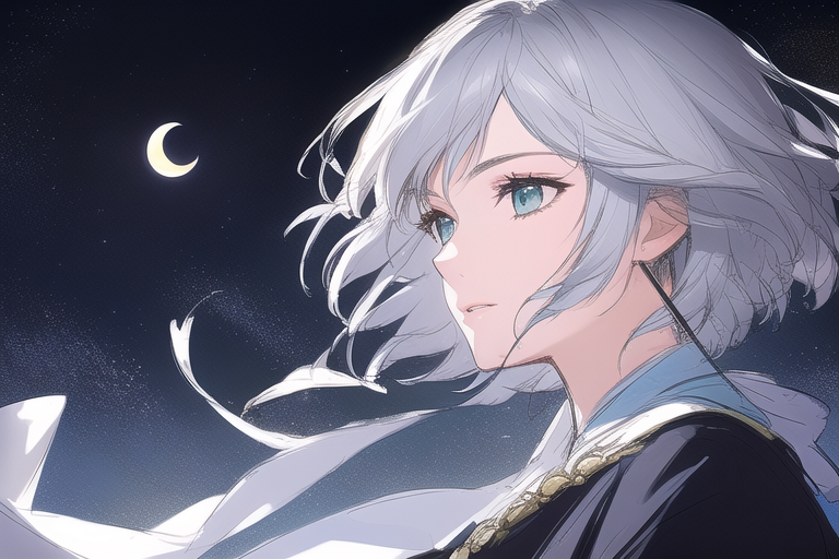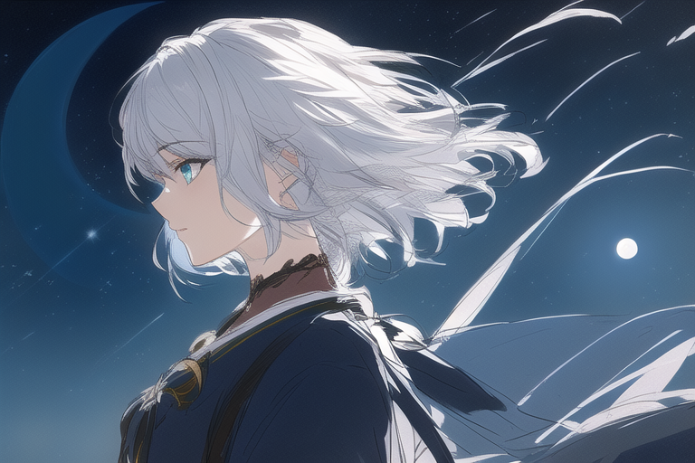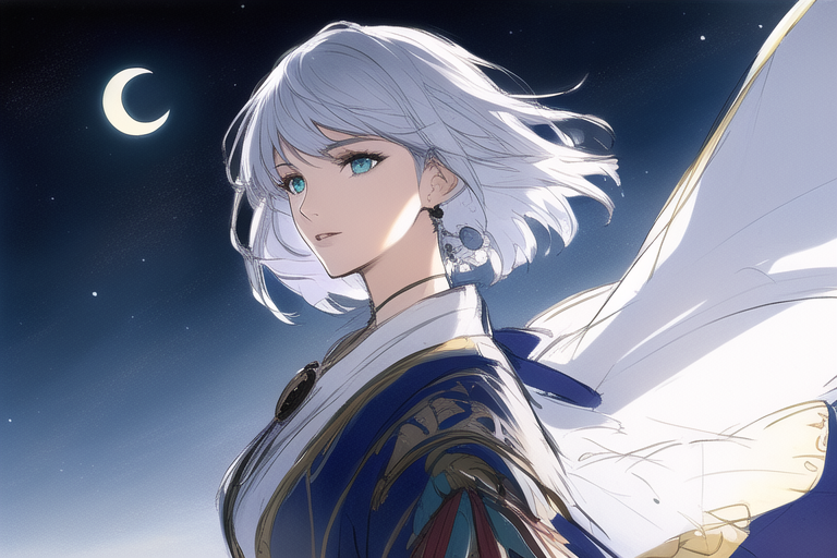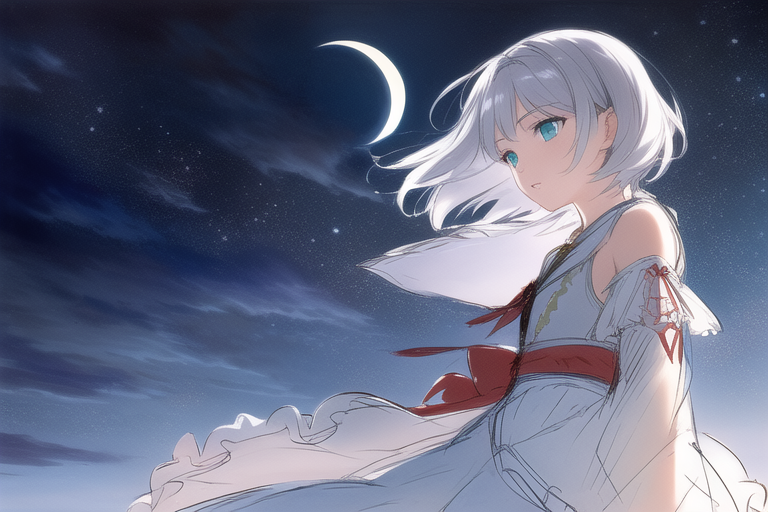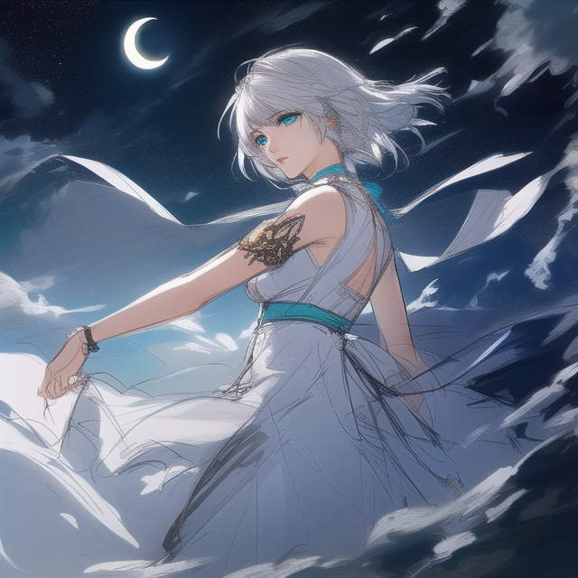 masterpiece, best quality, {{{{{masterpiece}}}}}, illustration, beautiful detailed, colourful, finely detailed, dramatic light, intricate details, 1 girl, {{shikishi, traditional_media}}, {{{sketch, k-pop, semi-realistic}}}, silver hair, turquoise eyes, younger, medium short hair, {straight hair, moonlight, crescent moon, dynamic angle, floating hair, {{wind}}